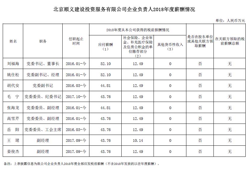 北京順義建設(shè)投資服務(wù)有限公司企業(yè)負(fù)責(zé)人2018年度薪酬信息披露