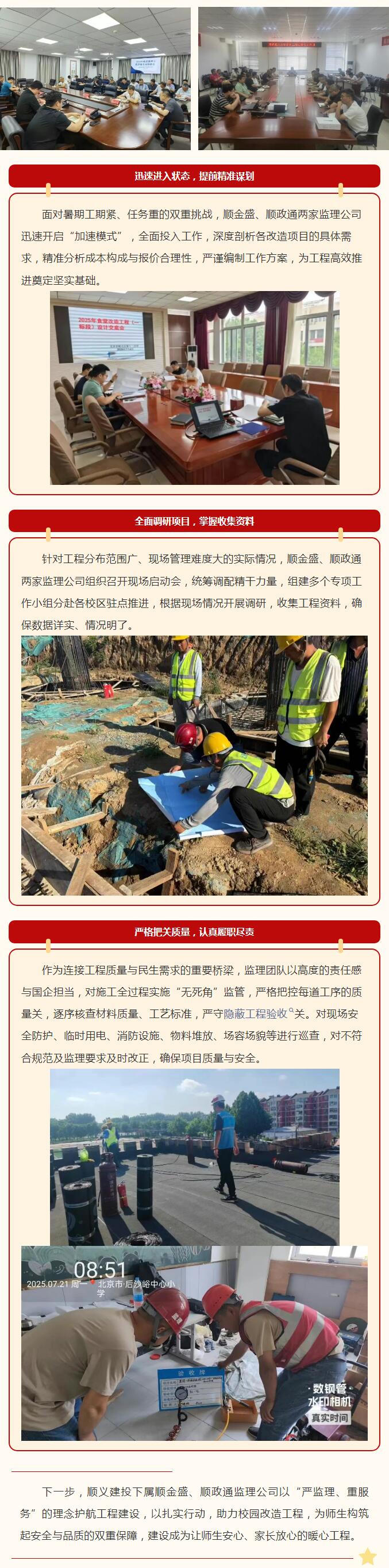 順義建投下屬子企業(yè)順金盛監(jiān)理公司、順政通監(jiān)理公司承接區(qū)內(nèi)部分學(xué)校食堂、校內(nèi)設(shè)施、專業(yè)教室改造,以及供暖系統(tǒng)升級和配套接收學(xué)校改造等多項(xiàng)監(jiān)理項(xiàng)目。面對時間緊、任務(wù)重和標(biāo)準(zhǔn)高等要求,兩家監(jiān)理公司高度重視,周密部署,多措并舉,確保項(xiàng)目按時保質(zhì)完成