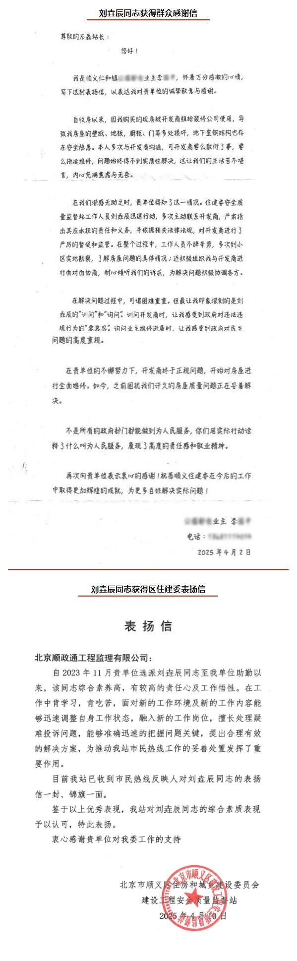 劉垚辰同志在服務過程中,始終以駐勤工作為中心、以切實解決群眾需求為導向,變“被動”為“主動”,充分發(fā)揮在監(jiān)理方面的專業(yè)所長,以過硬的業(yè)務知識,創(chuàng)新工作方式,主動傾聽群眾訴求,加班加點做好協(xié)調(diào),接連獲得群眾致謝錦旗及感謝信,生動詮釋了"民有所呼,我必有應"的服務擔當,為助力質(zhì)監(jiān)站相應工作的開展貢獻了重要力量,充分展示了順政通員工愛崗敬業(yè)的優(yōu)良品質(zhì),彰顯了順政通公司一貫堅守的嚴謹務實、精益求精的工作作風。